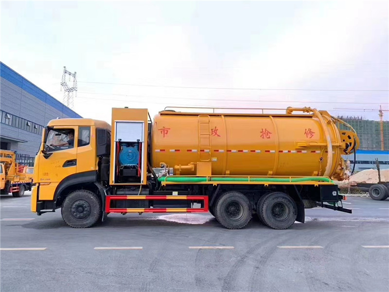 東風多利卡大型吸污車底盤配置:3800軸距,玉柴165馬力,245真空胎,帶原廠空調,電動玻璃,中控鎖。上裝配置:水箱4mm厚,配通潔215流量、22MPa高壓泵,卷盤,液壓馬達控制高壓管收放,直徑19高壓管60米,1個1.5公斤定制噴頭,1個手持直噴頭。污罐6mm厚,億豐SK-12水循環泵,防溢閥,視糞管,罐體帶舉升,后蓋液壓開啟,尾部一個150球閥排污口,一個100球閥進污口,水污互通,氣推水,一根8米吸污管帶陰陽端快接頭,其他標配。