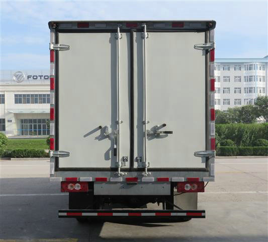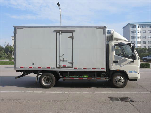福田奧鈴國五冷藏車底盤采用1995豪華車身,云內國五CNG115馬力,5檔,5T后橋,7.00R16輪胎,帶動轉,氣剎,排氣制動,感載比例閥,收錄機+AUX接口,冷藏廂體采用內外玻璃鋼,中間夾層保溫材料采用聚氨酯切片真空負壓一次復合成型;厚度8cm, 符合國家衛生部頒布食品等級要求,具有強度高、耐腐蝕、抗老化、導熱性能低、無污染、不容易損壞等特點,底板為鋁合金防滑花紋板,保證底板保溫性能及底板的抗沖擊強度。雙后開門門框架全部采用玻璃鋼制成的整體框架,門板重量輕,防腐性能好。雙后門中縫帶斜度,開關方便。門邊框密封采用進口優質橡膠(三元乙丙)密封條進行密封,保證廂體保溫效果的穩定性,門邊,門鎖及附件均為不銹鋼制作。