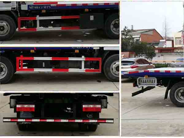 托舉質量:500kg.此車為道路清障專用車輛,專用裝置為拖臂.隨底盤選裝前面罩以及前霧燈.防護材料:Q235A,連接方式:左右側面及后下部防護均采用焊接連接,后下部防護斷面尺寸(mm):100×50,后下部防護離地高度(mm):380.ABS廠家及型號:襄陽東風隆誠機械有限責任公司/ABS/ASR-12V-4S/4M.此車整車長/軸距對應關系為(mm):5995/3308,5637/2950,5387/2700.選裝翻轉尾板和全落地圖片.