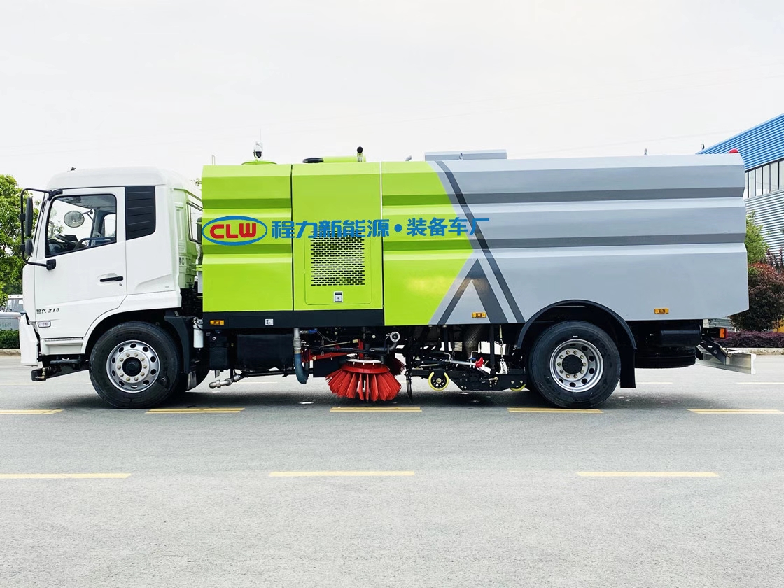 東風天錦國六洗掃車,由副發動機、風機、高壓水泵、清水箱、垃圾箱、左右立掃、帶噴水桿的寬吸嘴、低壓沖洗系統、掃盤降塵系統、液壓系統、專用裝置電控系統和副車架等改裝而成。副發動機驅動風機和高壓水泵,副發動采用東風康明斯六缸170馬力高壓共軌柴油發動機。風機用8.0高壓離心風機,效率高、風量大,最高風量達23500m3/h。高壓水泵采用國際知名CPX036型柱塞泵,流量合適,壓力高,允許最高壓力達10MPa。