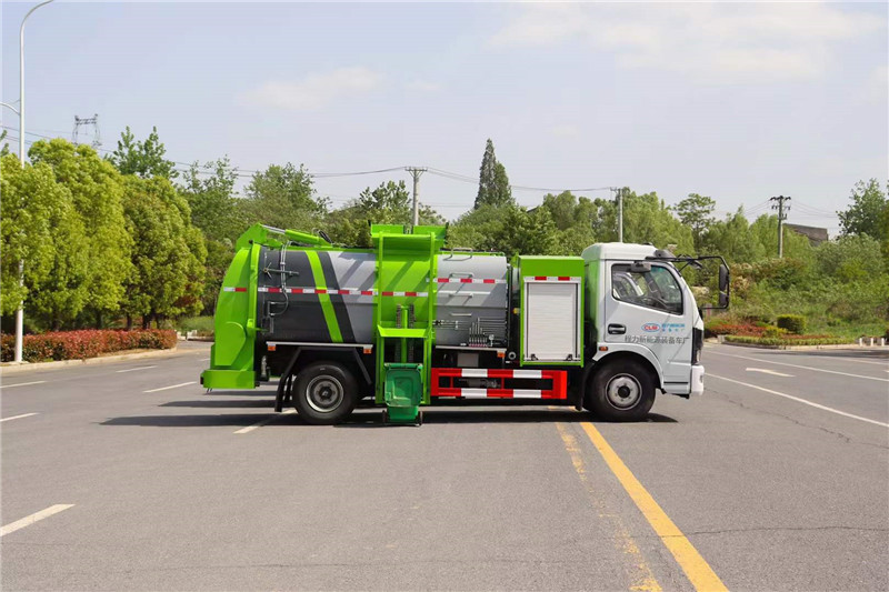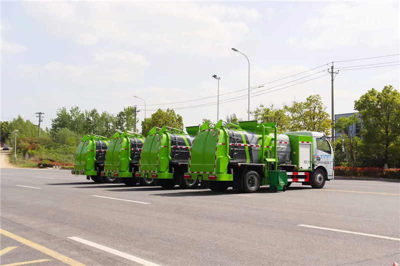 程力電動餐廚垃圾車底盤電池提供動力,永磁同步電機驅動,可根據需要實時調速,取力操作與底盤行駛系統無任何關聯,用車體驗感極佳。優質高強度 Q345 錳鋼制作無泄漏箱體,標配:1.弧形罐體,邊四底五/邊五底六。2.長源/皖液油泵,長源/中梅多路閥,知名液壓油缸。3.全推鏟卸料(不帶舉升功能),具有干濕分離功能。液壓后蓋,后蓋配防腐硅膠密封條。4.后門液壓鎖緊5.鏈條式提升機,可掛120/240升標準塑料垃圾桶。進料口蓋液壓開關。6.駕駛室內電控(提升機外部手動控制),后門鎖緊與后蓋開關的操作具有防誤操作。7.箱體帶清洗裝置(液壓馬達帶動高壓泵、帶水箱)。