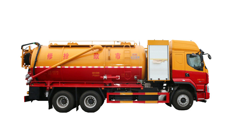 水罐污罐內封頭隔斷。清水罐兩側一邊一個消防栓進水口(副駕駛一側直通罐頂),兩側安裝量管、安裝小球閥放水。清水罐底部一個65方形排水閥。清水罐頂一個排氣閥。兩個三爪罐口(清水罐一個,污水罐一個)。清水罐、污水罐內部安裝爬梯。視糞窗(安裝圓球閥),兩倉互通。污水罐體內鋪不銹鋼薄板,罐體尾部一個700液壓開蓋,罐體兩側平臺用花紋板圍邊,平臺做滿。罐后封頭左側球閥1個6寸150球閥和4個寸的自流一個,600液壓門,右側4寸100鋁合金進料口。寸自流口后不開大門。體副駕駛后部一個150不球閥側排。清水罐、污水罐互通。平臺罐頂部兩側防滑平臺和護欄,后封頭一個視污管(安裝圓球閥),罐頂抽氣管加一個球閥開關,里面安裝自制防溢流閥。雙耀品浮315流量高壓泵,氣吹水,100米25高壓管,選裝濰柴420副發,后封頭液壓卷盤折疊、伸縮。后尾部封頭裝箭頭燈。M型保險杠(兩邊封口),安裝大工具箱,按照客戶提供圖片制作,其余廠內標配。