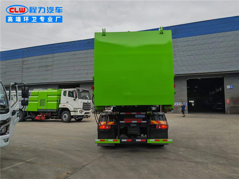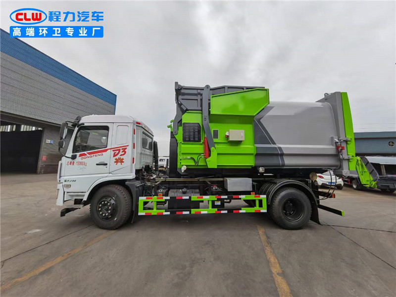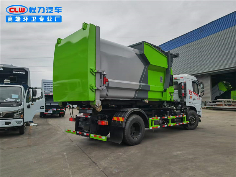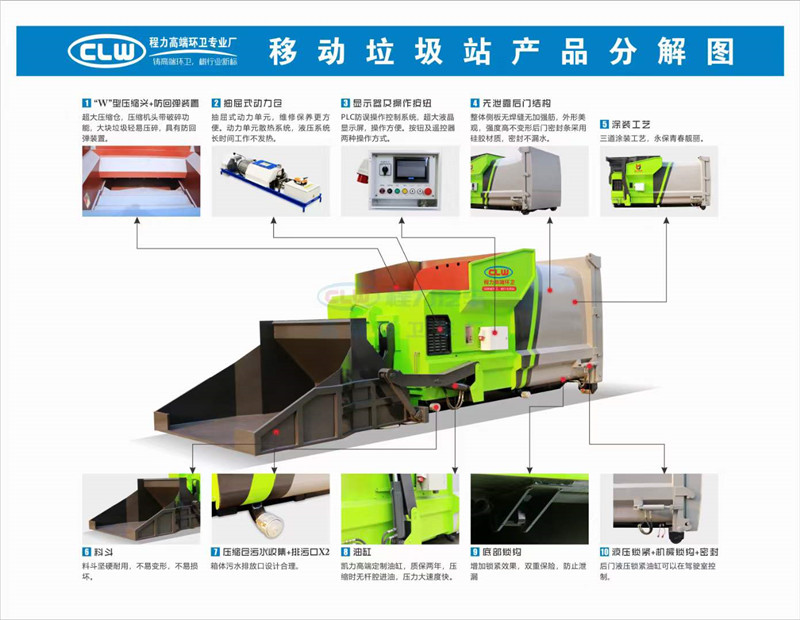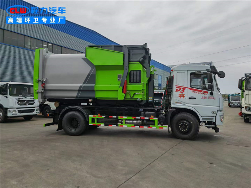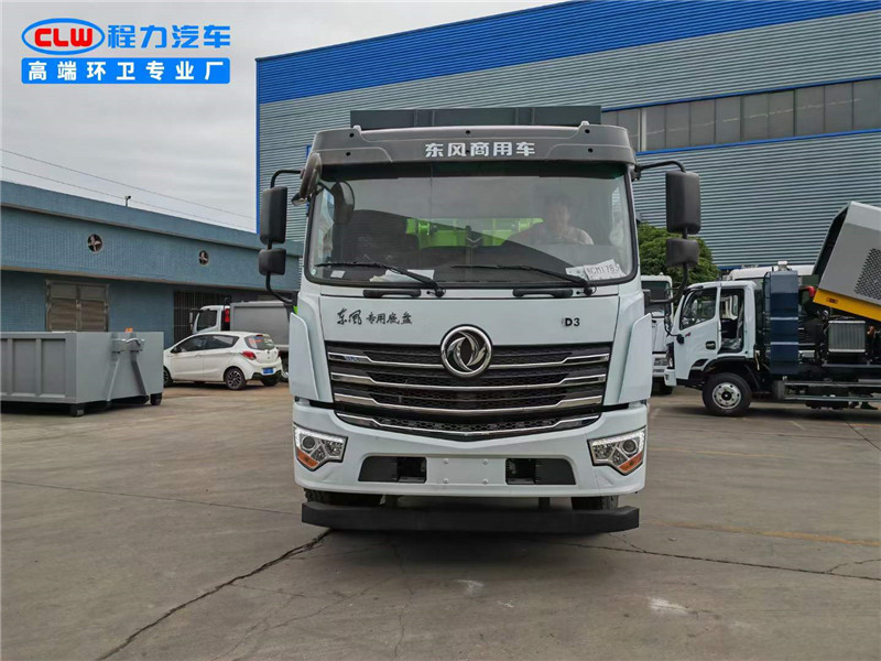 程力?臂套?垃圾車廠家使用東風專底玉柴200馬力,4500軸距。?質優?錳?制鋼?作箱體,?縮伸?套臂,無?遙線?控操作,?液皖?泵,威森?樂博?油缸,液?后壓?支腿。配備10?移方?動?圾垃?站。